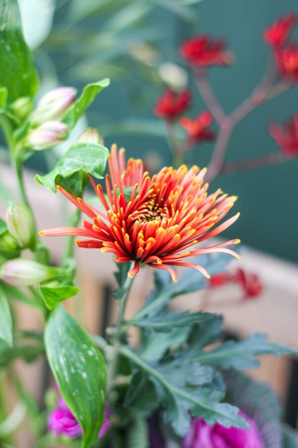 Gedroogde herfsttoef met statice. Opgemaakt met verschillende herfstartikelen zoals lampionnen, hortensia of rozenbottel. Verkrijgbaar in drie kleuren statice; roze, blauw of lila. De toef is gemaakt op een houten lat waardoor hij zowel op te hangen als neer te leggen is.