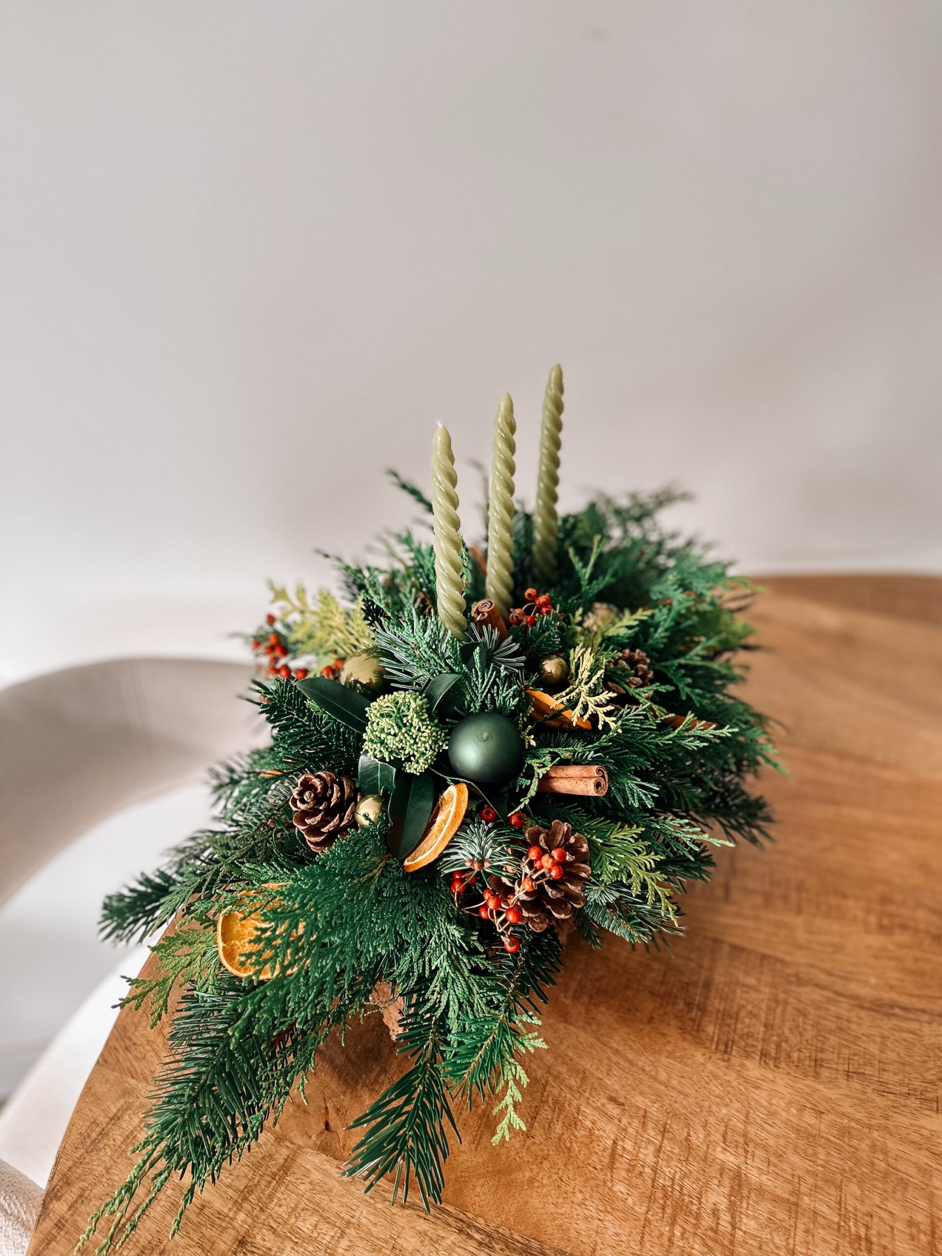 Een tafelstuk in onze stijl, met verschillende soorten kerstgroen en zo natuurlijk mogelijk. We maken het stuk op een ondergrond van kurk wat een heel robuuste uitstraling aan het geheel geeft. Wij hebben nu gekozen voor groene twist kaarsen, maar het is ook mogelijk om het stuk met witte kaarsen te maken. Net wat beter bij jou past. Het stuk is ongeveer 65cm. Ineke maakte al jaren alle kerststukken voor in de winkel, dus zij zal alles haarfijn uitleggen.