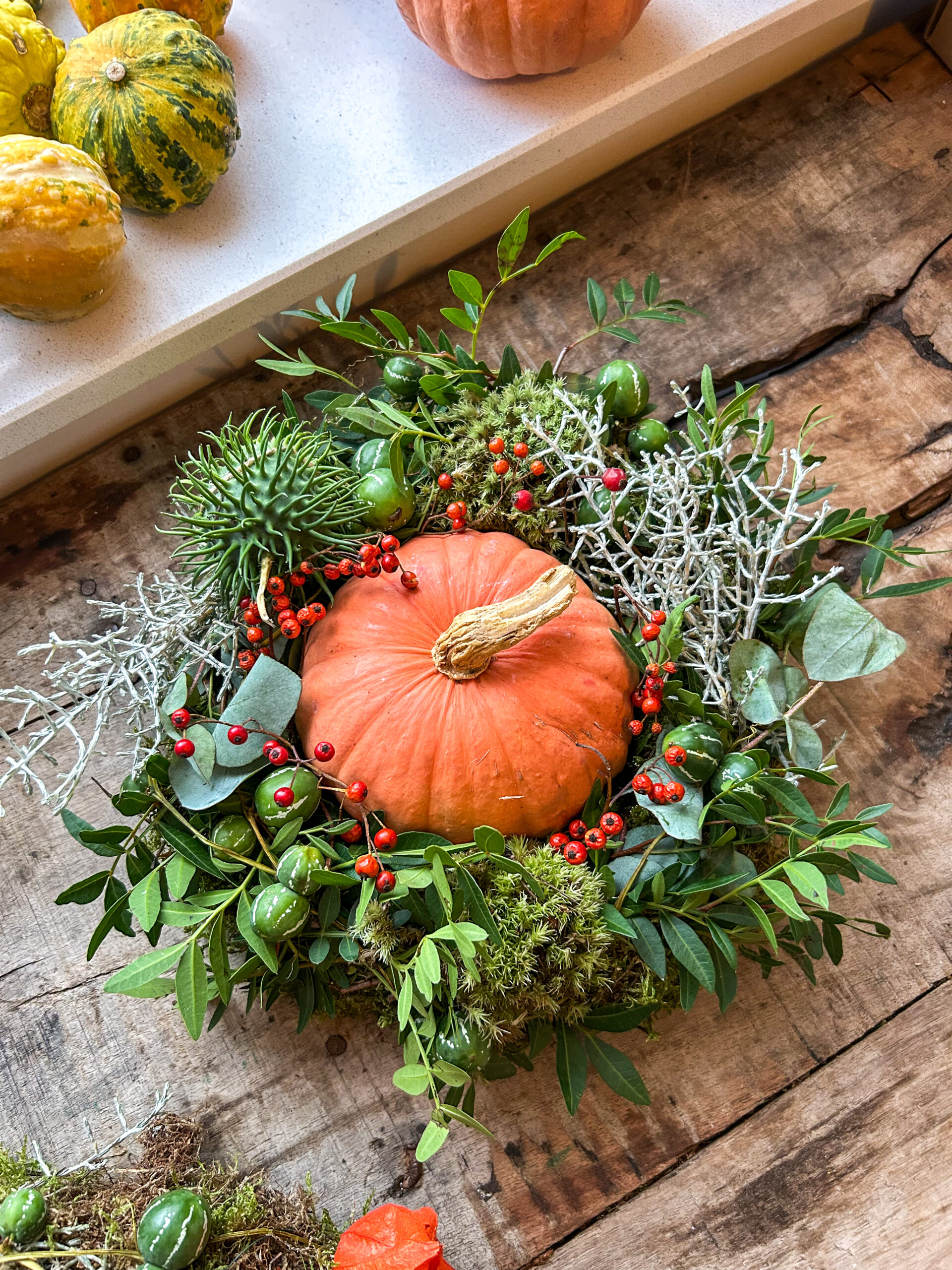 Herfstkrans van ongeveer 30cm doorsnee. Mooi om op een dienblad te leggen, maar natuurlijk ook om op te hangen. Het is het beste om de krans binnen te bewaren of buiten onder bijvoorbeeld een afdakje. Deze variant is met rozenbottels. Er is ook een variant met lampionnen te verkrijgen.