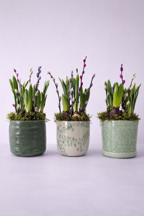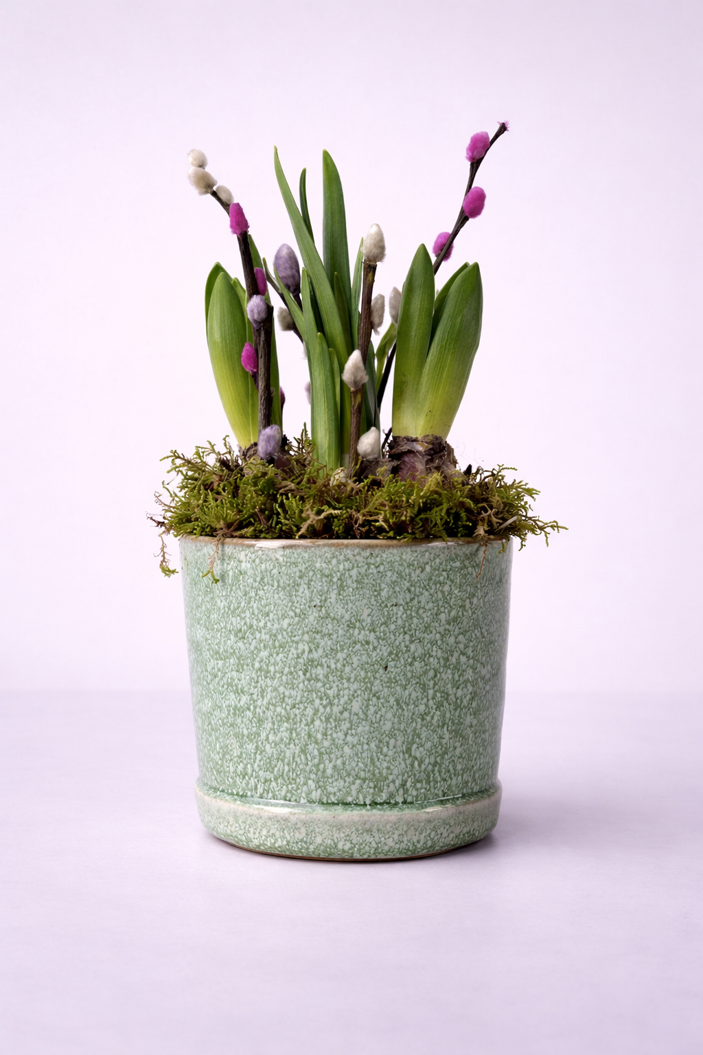 Vrolijke set met een wax hyacint, kandelaar + twistkaars & vaasje met hyacint op water.