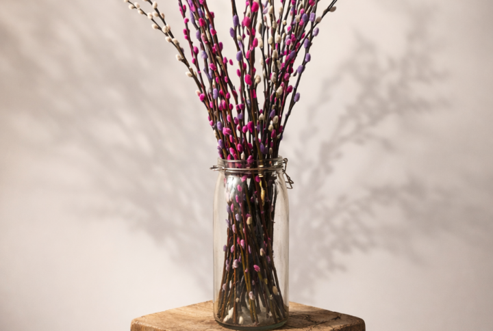 Keramieken pot met allerlei verschillende soorten bollen; druifjes en crocussen. Afgemaakt met verschillende soorten mos.